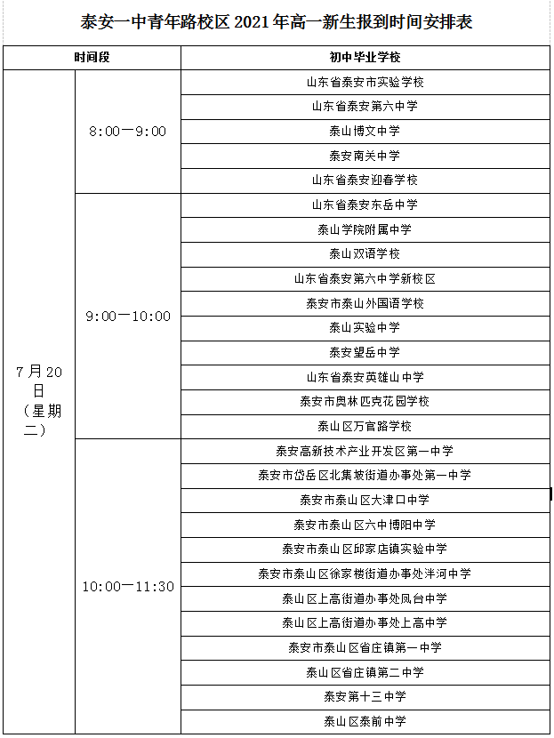 泰安一中青年路校区2021级新生报到时间安排表