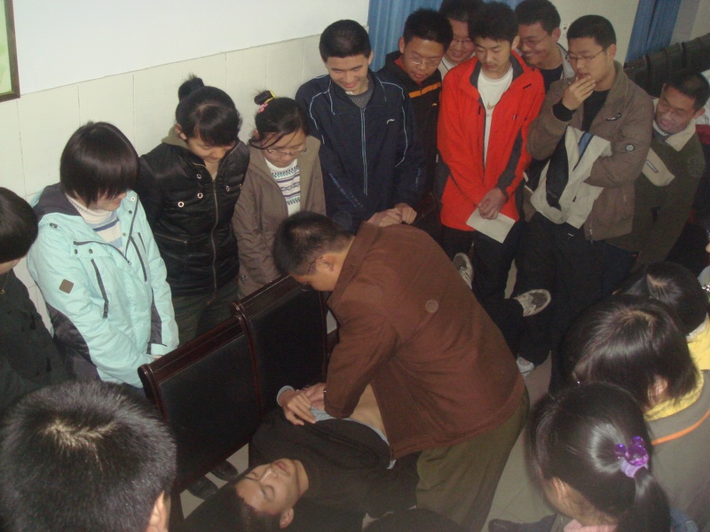 “阳光地带医学社”在解放军第88医院的大夫指导下学习急救常识